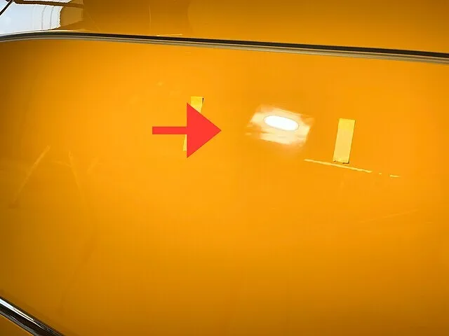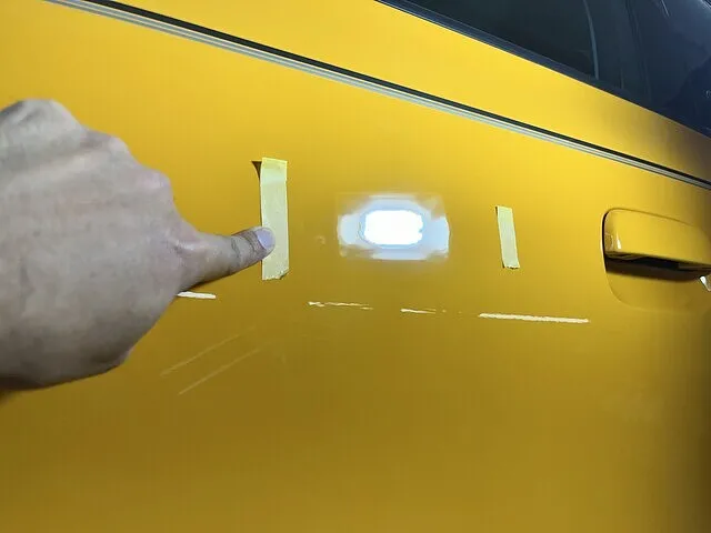 画像では分かり難いですが、ドアに10センチ大の横方向への直緯のへこみがあります。まず初めにこちらのデントリペアを実施。